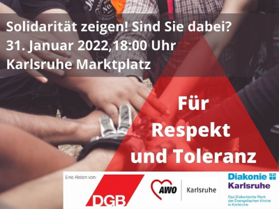 Für Solidarität und Respekt in Karlsruhe Wir wollen am Montag, den 31. Januar 2022 ab 18:00 Uhr als Stadtgesellschaft auf dem Marktplatz ein Zeichen der Solidarität setzen (wenn möglich mit einer Kerze oder einem Licht)! [...]