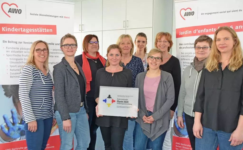 Auf dem Bild zu sehen sind zehn junge Frauen, die im Bereich Kitas der AWO Karlsruhe arbeiten, eine von ihnen hält „Ecoles maternelles / Bilinguale Kindertageseinrichtung – Elysée 2020“ - die Auszeichnung für die bilinguale Arbeit in den Händen.