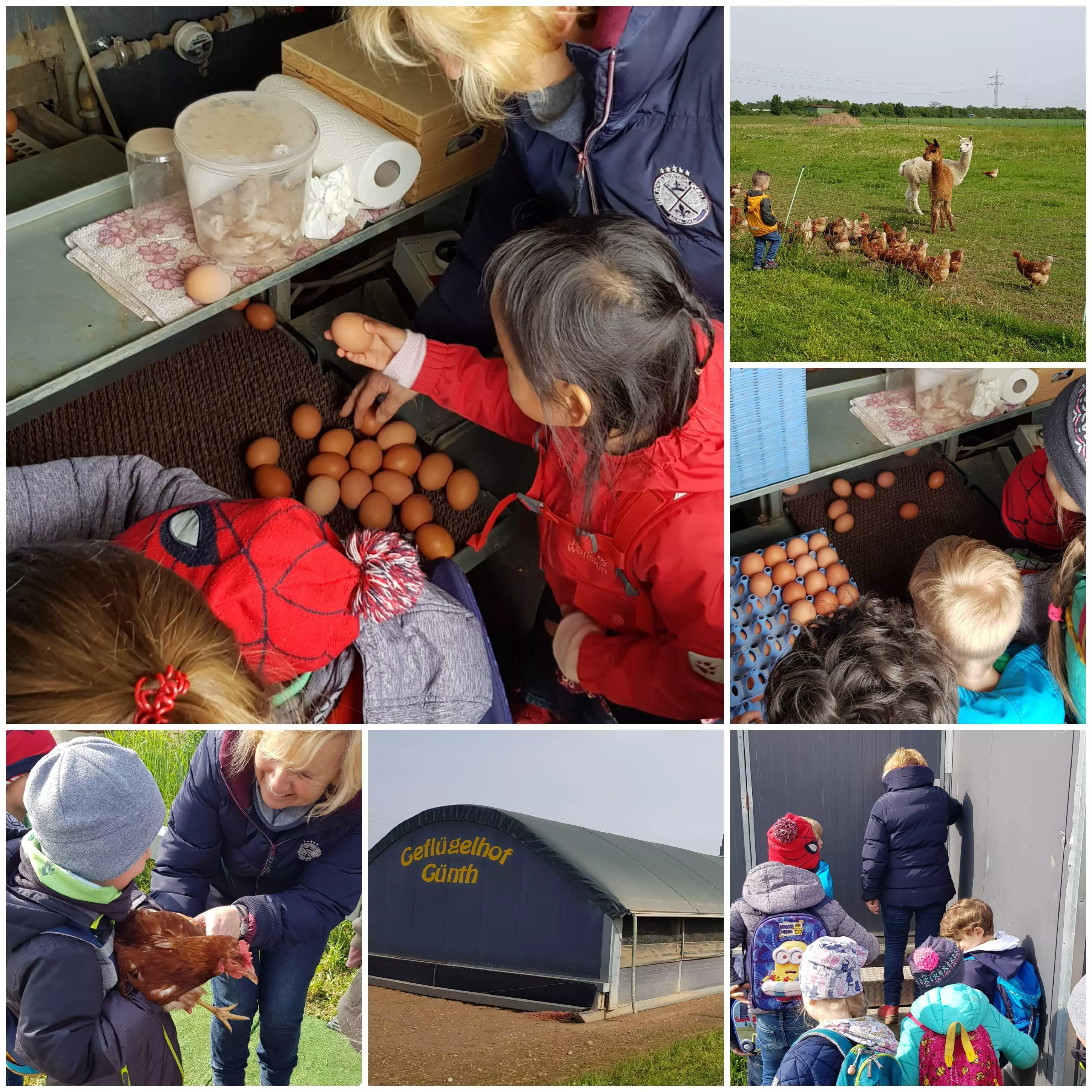 Im Rahmen des Projektes von Philipp Brigel, Erzieher im Anerkennungsjahr, zum Thema „Gesunde Ernährung“ waren die Vorschulkinder der Kita Krone Anfang Mai in Ettlingen/Bruchhausen und besuchten die Hühner auf ihrem Freigehege inklusive mobilem Stall auf dem Geflügelhof Günth. Hier verbringen die Hühner ihre Nacht. Am Morgen werden sie dann wieder ins Freie gelassen und springen den Tag über auf den Feldern herum. Zu ihrem Schutz vor Füchsen hat sich Familie Günth zwei Alpakas angeschafft. Diese verteidigen die Hühner gegenüber Füchsen und Hunden. Gemeinsam mit Frau Günth konnten sich die Kinder den Stall anschauen, die Hühner ins Freie lassen und das Eierfließband begutachten. Die Kinder haben geholfen die Eier in die Eierschachteln zu sortieren und im Verkaufsraum wurde allen noch gezeigt, wie die Eier der Größe nach automatisch sortiert werden. Im Hofladen werden diese dann verkauft. Zusätzlich gibt es einen automatischen Eierautomaten oder die Möglichkeit die Eier auf verschiedenen Märkten in der Region zu kaufen.