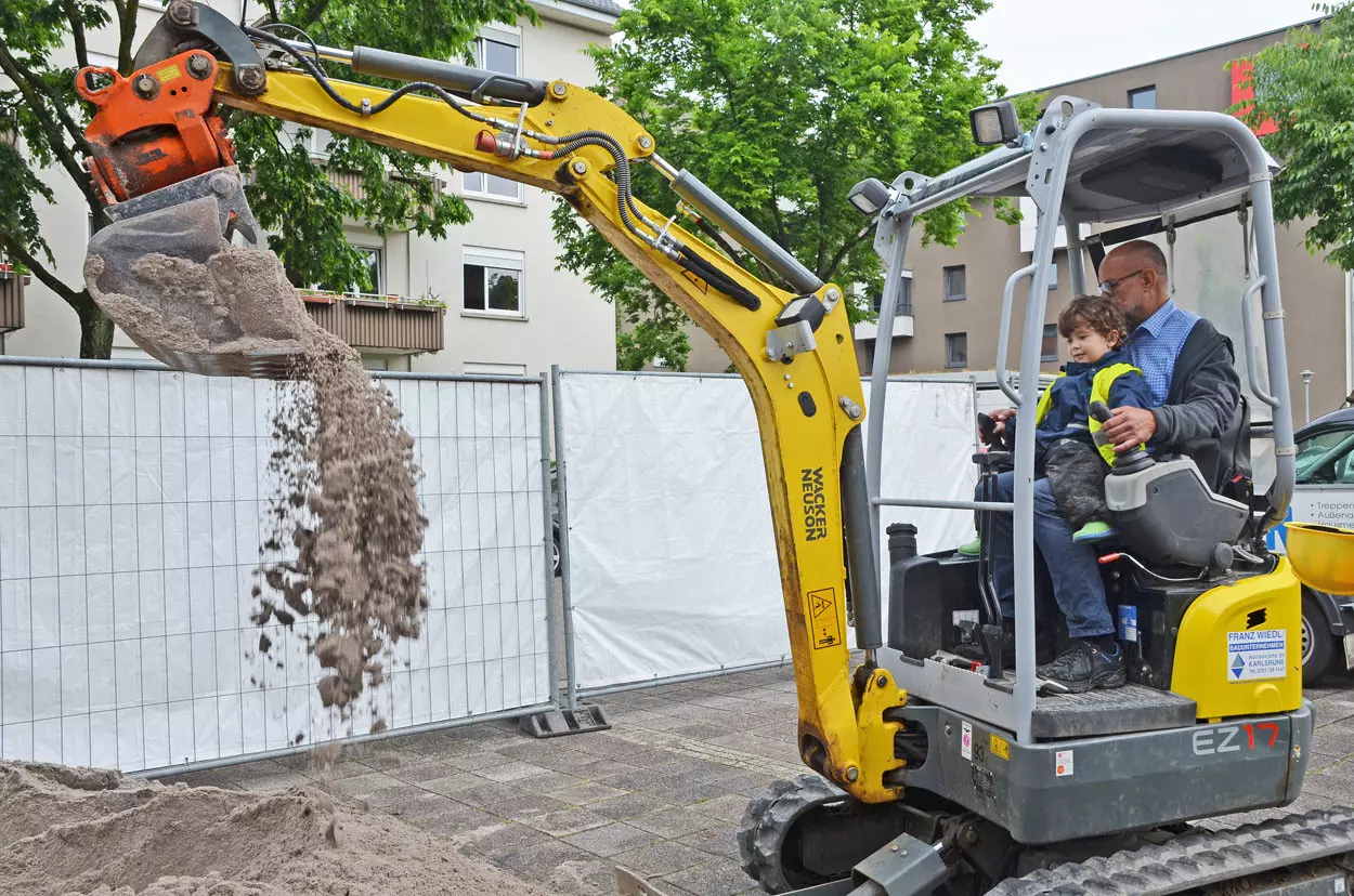 Ein Junge sitzt auf dem Schoß von einem Baggerfahrer und bedient die Maschine.Die Kinder der deutsch-französischen Kita Mikado der AWO Karlsruhe gemeinnützige GmbH und ihre Erzieher*innen staunten nicht schlecht, als sie Ende Mai die Baustelle der SVG Wohnen eG an der Berckmüllerstraße 9 bis 13 betraten. „Wir hatten alle zu einem Fest eingeladen, dies sollte eine kleine Entschädigung für die Baustelle und die damit verbundenen Unannehmlichkeiten der letzten Monate sein“, erklärte Thomas Herbst, Vorstand der SVG Wohnen e.V. In der Berckmüllerstraße 9 bis 13 entstehen, seit dem Abbruch der Gebäude aus dem Jahr 1937, 53 Neubauwohnungen sowie eine Tiefgarage mit 40 Stellplätzen. Von den 53 Wohnungen werden 49 Wohnungen öffentlich gefördert. Die Fertigstellung der Gebäude ist Mitte 2019 geplant. Die AWO Kita Mikado liegt direkt hinter dem Wohnhaus an der Theodor-Rehbock-Straße 2.Kinder besichtigen eine Baustelle.