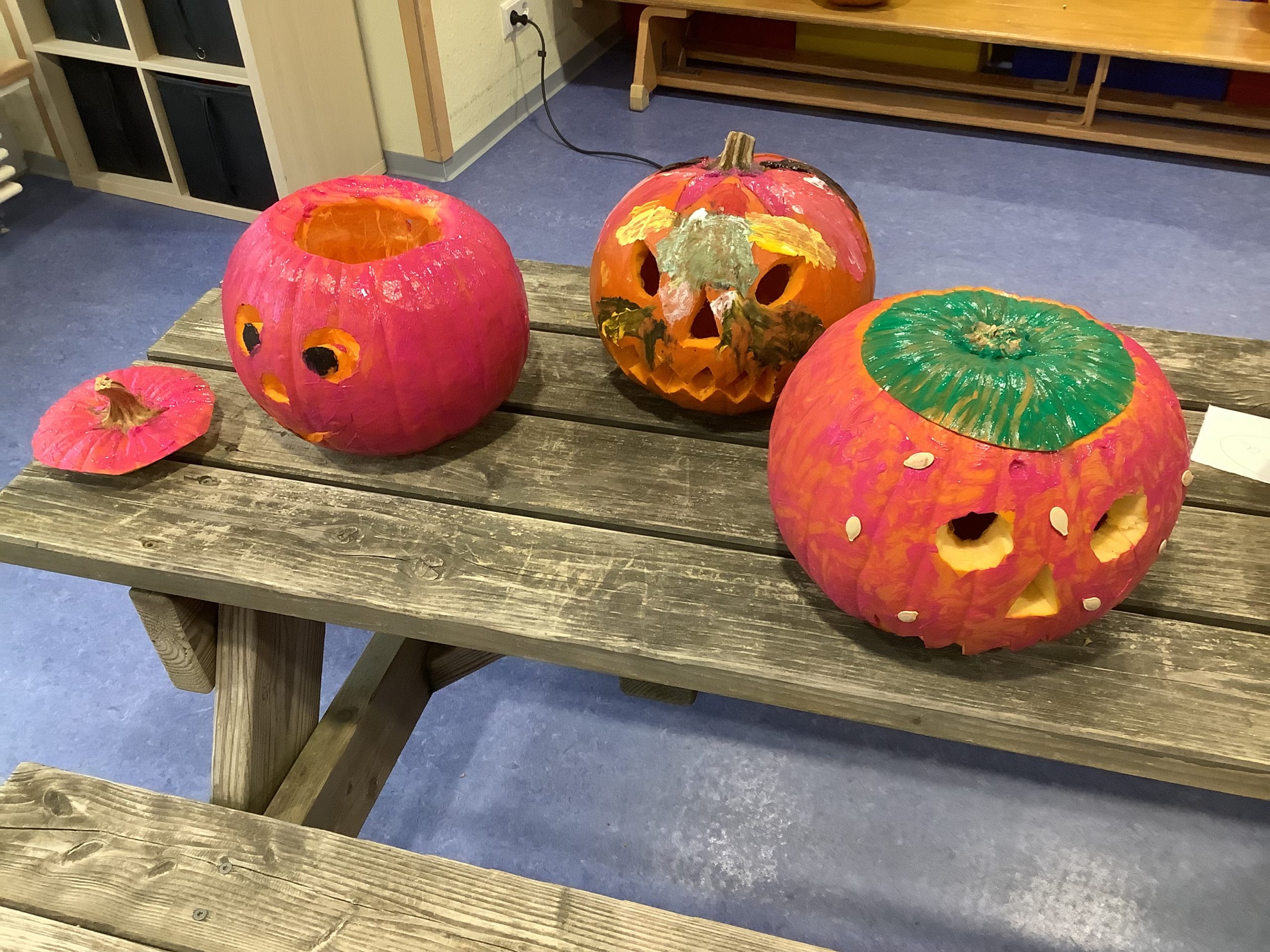 Herbstzeit ist Kürbiszeit, und in unserer Kita Bernstein wurde diese Saison auch in diesem Jahr wieder zu einem ganz besonderen Erlebnis. Dank einer großzügigen Spende der Firma Gamb aus Eschbach, die durch die Vermittlung der Familie Baam zustande kam, gab es eine schöne Überraschung. Eine Ladung prächtiger Kürbisse, genug, damit jedes Kind einen eigenen gestalten konnte. In der darauffolgenden Woche verwandelte sich die Kita an drei Nachmittagen in eine Stätte der Kreativität und Gemeinschaft. Eltern wurden eingeladen, gemeinsam mit ihren Kindern die Kürbisse auszuhöhlen und zu kunstvollen Halloweengesichtern zu gestalten. Bei diesem fröhlichen Beisammensein entstanden nicht nur schaurig-schöne Kunstwerke, sondern auch unvergessliche Momente zwischen Eltern und Kindern. Jeder geschnitzte Kürbis war einzigartig und spiegelte die individuelle Kreativität der Kinder wider – von grinsenden Gesichtern bis hin zu fantasievollen Mustern.