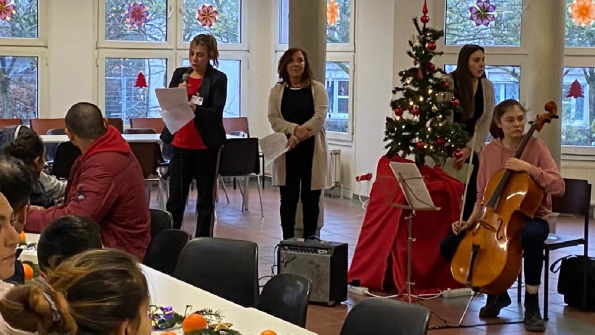 Danach sangen die Kinder des Lernfreunde-Haus 5 Weihnachtslieder. Eigentlich sollte ein Zauberer auftreten, doch dieser musste kurzfristig absagen. Spontan ist Freddy Sahin-Scholl (Bariton und Sopran – Ehemann der Leiterin des Lernfreundehauses und bekannter Musiker und Komponist) eingesprungen und hat gesungen. Die Bewohner*innen waren von seinem Gesang überwältigt.