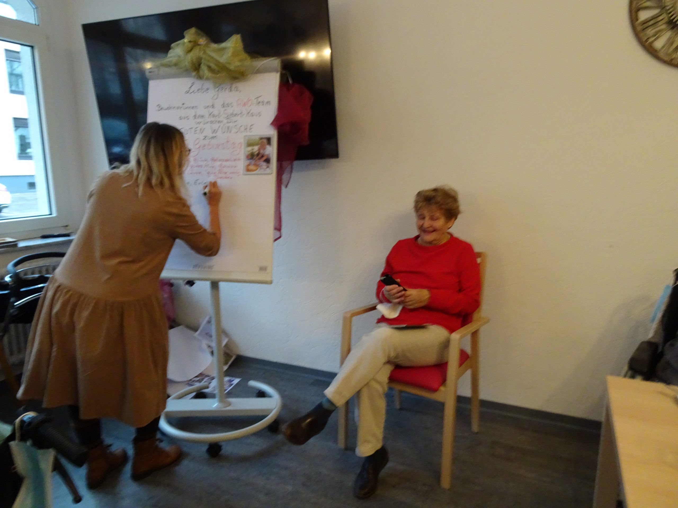 Dabei entstand ein sehr persönliches Geschenk. Die Gäste überreichten der Jubilarin ein Plakat. Darauf hatten sie alle guten Wünsche für Gerda Martin aufgeschrieben. Ein Gläschen Sekt zum Anstoßen durfte natürlich nicht fehlen.