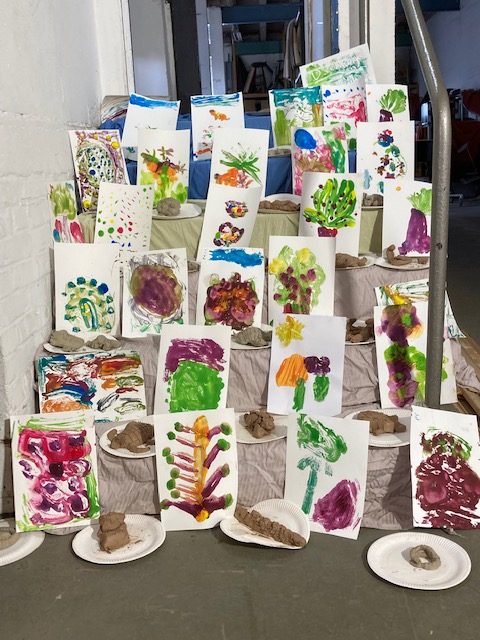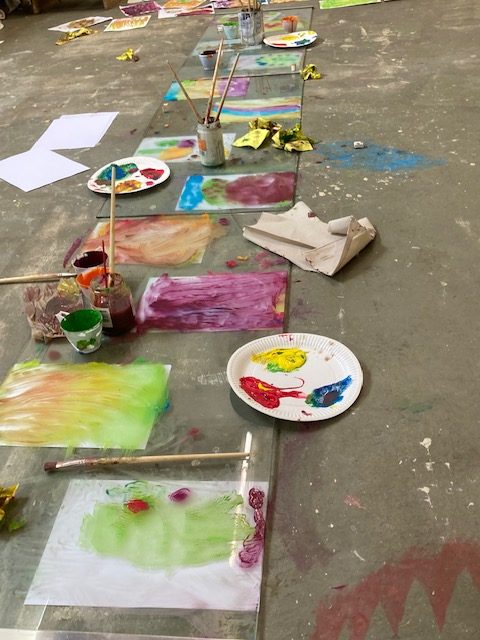 Eine große Halle, so viele Pinsel, so viele Farben, – ein Schlagzeug, ein Klavier und vieles mehr. Und dann noch jede Menge Bilder an der Wand; vom kleinen Format bis zum wandgroßen …Geduldig beantwortete der Künstler alle Fragen der Kinder, zeigte die vielen Materialien, mit denen er arbeitet und schließlich auch einige von ihm gemalte Kunstwerke.