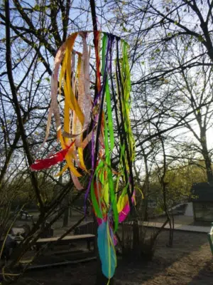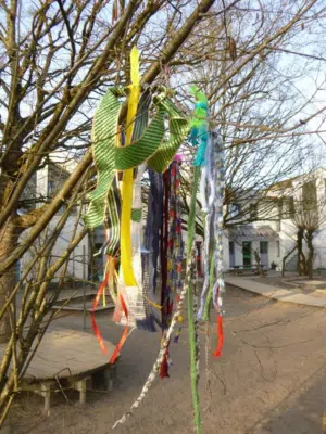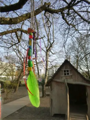 - Windspiel aus Stoffstreifen, Perlen und Metallring hängt zwischen Bäumen im Außengelände der AWO Kita.