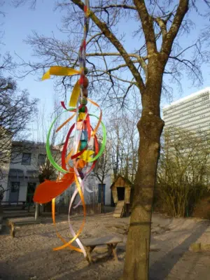 - Selbstgestaltete Windspiele bringen Farbe und Bewegung in den Kita-Garten.