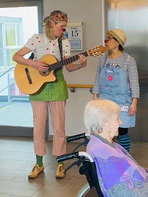 Es beginnt oft mit einem zarten Zupfen an der Gitarre oder einem bunten Farbtupfer im Türrahmen. Im Seniorenzentrum Grünwinkel sind die Klinikclowns regelmäßige Gäste, doch sie bringen keine laute Show. Ihr Besuch ist eine Übung in Achtsamkeit. Mit feinem Gespür tasten sie sich vor – von Bewohner*in zu Bewohner*in, von Zimmer zu Zimmer.